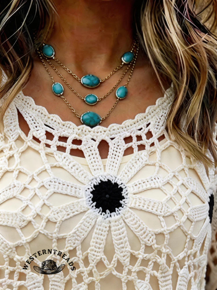 ⢠Boho-Western crochet blouse with delicate floral lace, romantic openwork, and a timeless daisy pattern for a vintage-chic look.